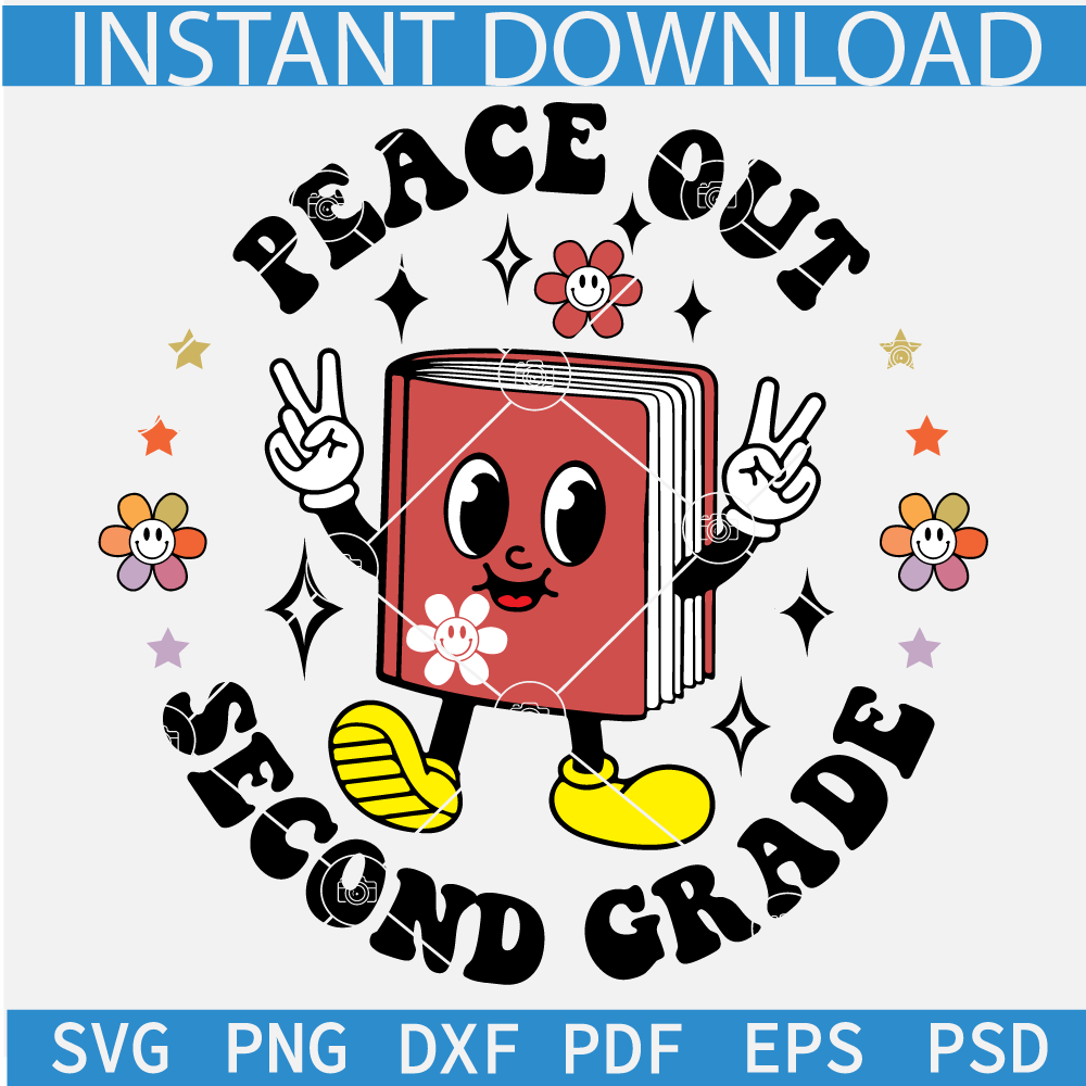 Happy Face Peace Out Second Grade SVG, Peace Out 2nd Grade Smiley Book SVG, Peace Out Second Grade Peace Hand Sign SVG, Peace Hand Gesture Peace Out Grade two SVG, Last Day of School Peace Out SVG, Grade Two Graduation SVG